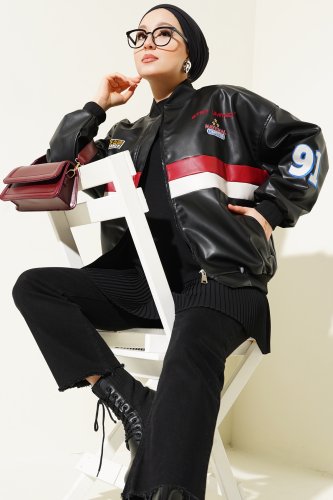 T0698 Baskılı Suni Deri Bomber Ceket Siyah