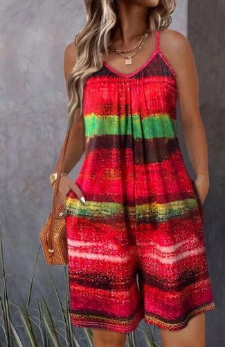 Kadın ip askılı yuvarlak yakalı cepli desenli kısa süprem tulum