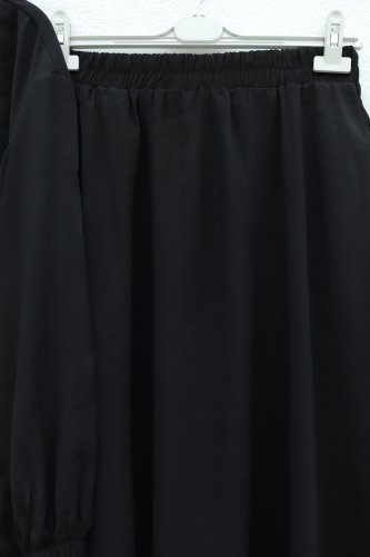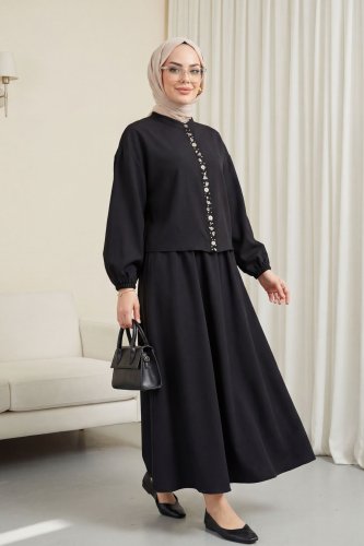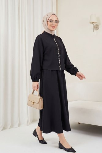• Kolu Lastikli Önü İncili Düğmeli Etekli Modal Takım Siyah