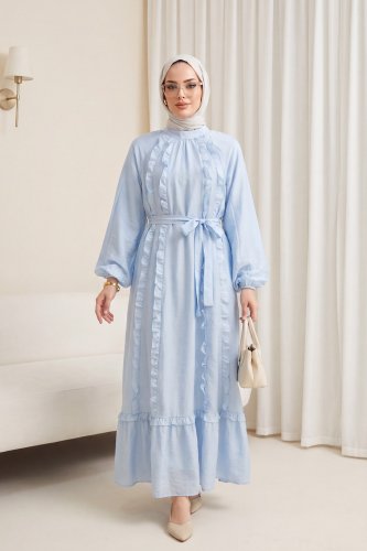 Önü Fırfırlı Beli Kemerli Kolu Lastikli Astarlı Cupra Elbise Bebe Mavi