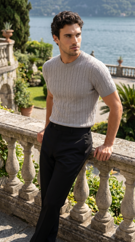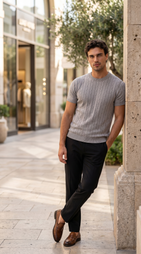 • Erkek Örgü Desen Bisiklet Yaka Triko Tişört 100 Pamuk Akrilik