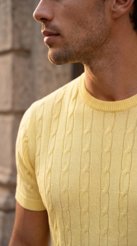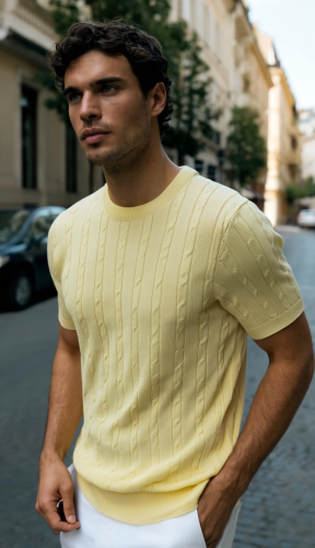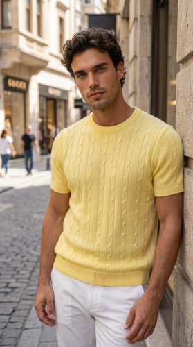 • Erkek Örgü Desen Bisiklet Yaka Triko Tişört 100 Pamuk Akrilik
