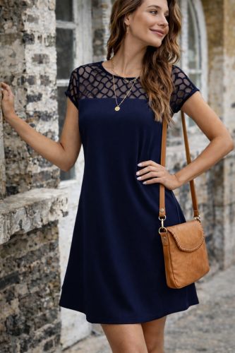 • Kadın kısa kollu bisiklet yakalı tül detaylı kısa janjan krep elbise
